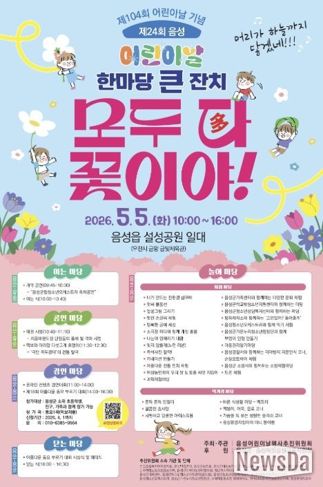 이번 행사는 음성어린이날행사추진위원회가 주최·주관하며, ‘모두 다(多) 꽃이야!’를 주제로 어린이들이 마음껏 꿈을 펼치고 가족과 함께 즐거운 추억을 만들 수 있도록 다채로운 프로그램으로 운영될 예정이다.