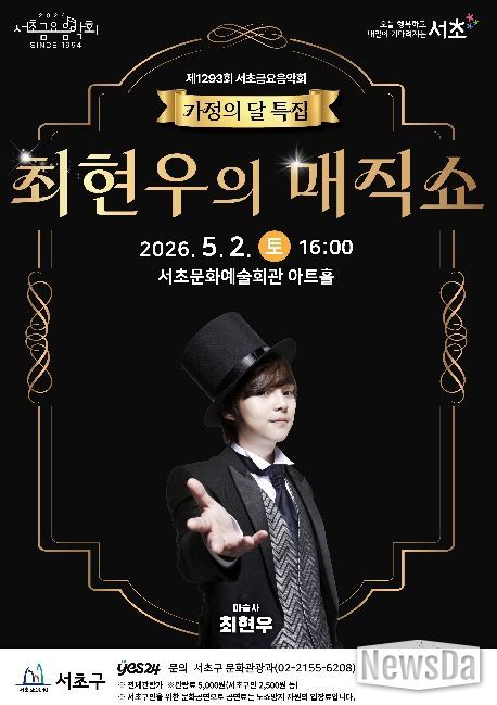 뉴스다 최광묵 기자 | 서울 서초구가 가정의 달 5월을 맞아 오는 5월 2일 토요일 오후 4시, 서초문화예술회관 아트홀에서 서초토요콘서트 '최현우의 매직쇼'를 개최한다고 밝혔다.