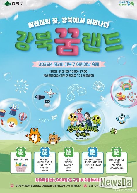 뉴스다 최광묵 기자 | 서울 강북구가 제104회 어린이날을 맞아 오는 5월 2일 북서울꿈의숲에서 오전 10시부터 오후 5시까지 ‘제3회 강북구 어린이날 축제’를 개최한다.