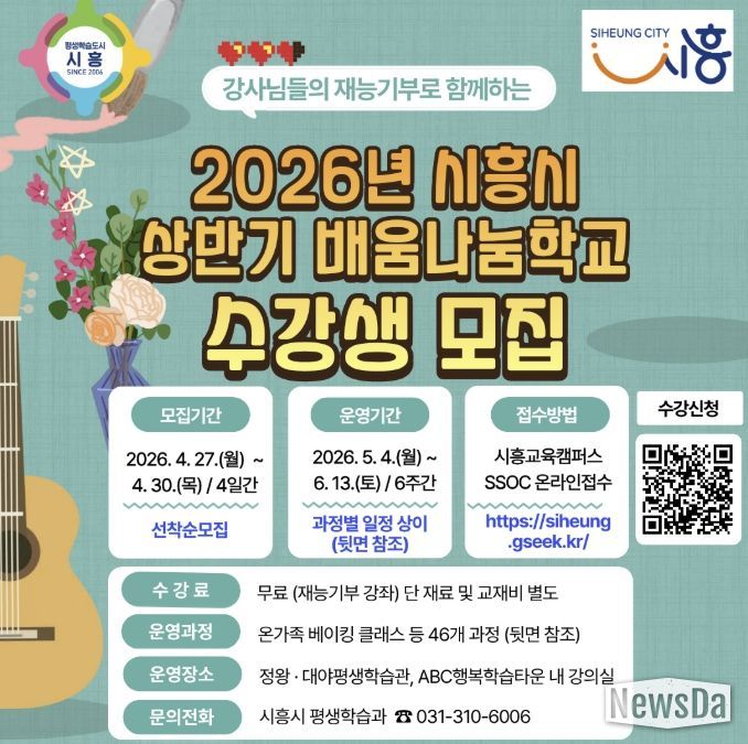 뉴스다 최광묵 기자 | 시흥시는 시민이 직접 강사가 되어 재능을 나누는 열린 평생학습 사업 ‘2026년 상반기 시흥시 배움나눔학교’에 참여할 수강생을 모집한다.