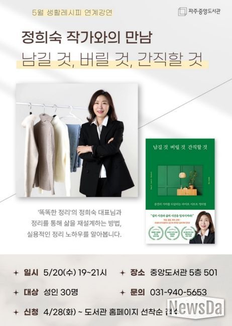 뉴스다 최광묵 기자 | 파주시 중앙도서관은 오는 5월 20일 19시, 정리 전문가 정희숙 작가를 초청한 '남길 것, 버릴 것, 간직할 것' 강연을 개최한다.