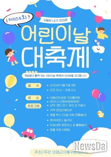 뉴스다 최광묵 기자 | 의령군은 다음달 5일 제104회 어린이날을 맞아 의령군민공원 기오름마당에서 ‘제104회 의령군 어린이날 대축제’를 개최한다고 밝혔다. 이번 행사는 의령군아동위원협의회가 주관한다.