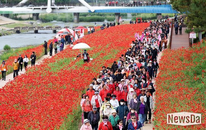 축제의 백미는 동진천변에 펼쳐진 거대한 붉은 봄꽃 군락이다. 왕복 3.3킬로미터(km) 구간을 따라 양귀비 10만 본, 작약 16만 본, 꽃잔디 8만 본을 가득 심고 끝없는 붉은 꽃물결을 빚어냈다.