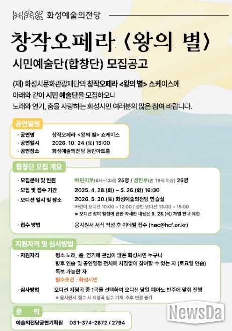 뉴스다 최광묵 기자 | (재)화성시문화관광재단은 오는 10월 개최 예정인 창작오페라 '왕의 별' 쇼케이스 무대에 참여할 시민합창단을 모집한다.