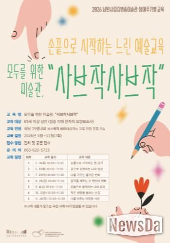 뉴스다 최광묵 기자 | 남원시립김병종미술관은 오는 5월부터 11월까지 실버세대를 위한 생애주기별 예술교육 프로그램 '모두를 위한 미술관, ‘사브작사브작’' 을 운영한다고 밝혔다.