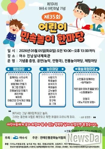 뉴스다 최광묵 기자 | 여수시는 제104회 어린이날을 맞아 5월 5일, 아이들이 가족과 함께 전통문화를 즐기며 마음껏 뛰놀 수 있는 민속놀이 놀이 한마당을 개최한다.