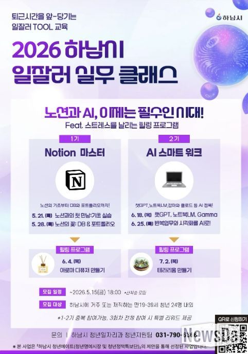 뉴스다 최광묵 기자 | 하남시는 관내 청년들이 현장에서 바로 활용할 수 있는 실무 역량을 키우고 또래 청년 간 교류 기회를 확대하기 위해 오는 5월부터 ‘2026년 하남시 일잘러 실무클래스’를 운영하고 1기와 2기 참여자를 모집한다고 밝혔다.