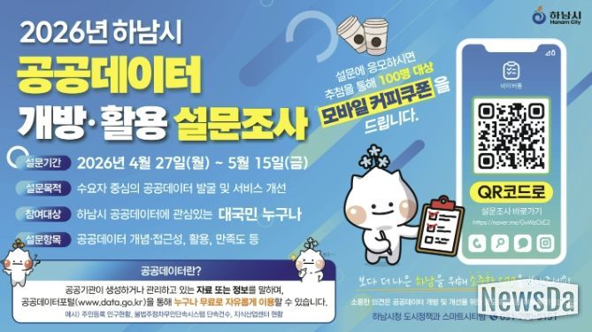 뉴스다 최광묵 기자 | 하남시는 시민과 기업, 연구기관 등 다양한 수요자의 의견을 반영해 공공데이터 개방 및 활용을 확대하고자 ‘2026년 하남시 공공데이터 설문조사’를 실시한다고 밝혔다.