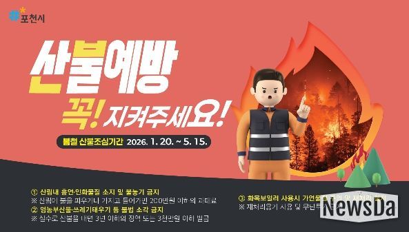 뉴스다 최광묵 기자 | 포천시는 봄철 건조한 날씨와 강풍으로 산불 발생 위험이 높아짐에 따라 산불조심기간이 종료되는 오는 5월 15일까지 경계를 늦추지 않고 산불예방 활동에 총력을 기울이고 있다.