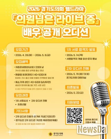 뉴스다 최광묵 기자 | 경기도의회는 2026년도 경기도의회 웹드라마 ‘의원님은 라이브 중(가제)’에 출연할 배우를 공개 모집하기 위해 오디션을 개최한다.