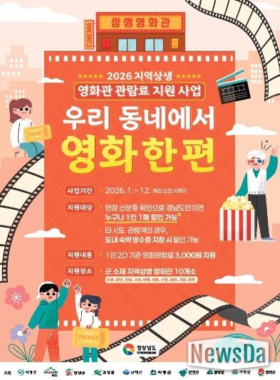 뉴스다 최광묵 기자 | 거창군은 다가오는 5월 가정의 달을 맞이해 군민들의 문화 향유 기회를 확대하고 지역 영화관의 활성화를 돕기 위해 ‘2026년 지역상생 영화관 관람료 지원사업’을 시행한다.