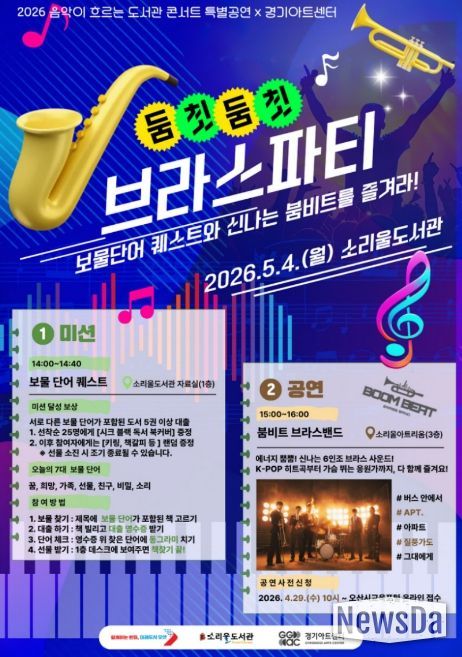 뉴스다 최광묵 기자 | 오산시 소리울도서관은 제104회 어린이날을 앞둔 오는 5월 4일 경기아트센터와 협업해 ‘2026 음악이 흐르는 도서관 콘서트’ 특별공연인 ‘둠칫둠칫 브라스 파티’를 개최한다고 밝혔다.