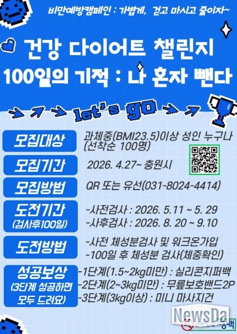 이번 챌린지는 참여자의 자발적인 의지와 실천을 최우선 가치로 둔다. 보건소는 참가자가 100일 동안 중도 포기하지 않고 스스로 건강 체중을 찾아갈 수 있도록 체계적인 환경을 조성하고 전문가의 가이드를 제공하는 ‘페이스메이커’역할을 할 예정이다.