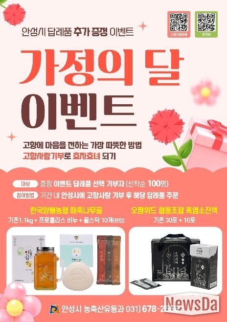 뉴스다 최광묵 기자 | 안성시는 오이데이와 5월 가정의 달을 맞아 고향사랑기부제 참여 확대와 지역 농산물 소비 촉진을 위해 ‘오이데이 이벤트’와 ‘가정의 달 이벤트’를 추진한다고 밝혔다.