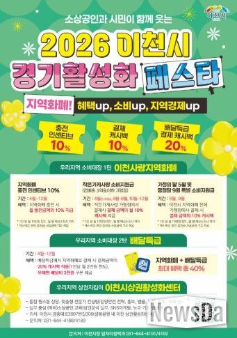 한편, 이천시에서 연말까지 진행하고 있는 ‘2026 이천시 경기활성화 페스타’의 주요 혜택 내용은 ➀지역화폐 충전 시 인센티브 10% 지급(월10만 원 한도) ➁작은가게(연매출 3억 원 이하 가맹점)에서 결제 시 10% 캐시백 지급[월 10만 원 한도 / 5월(가정의 달), 9월(추석달)은 전체 가맹점에서 결제 캐시백 혜택] ➂배달특급에서 지역화폐 결제 시 추가 20% 캐시백 지급 혜택(월 2만 원 한도) 등이 있으며, 배달특급에서 지역화폐로 결제할 경우 최대 40%까지 할인되는 놀라운 혜택을 볼 수 있다.