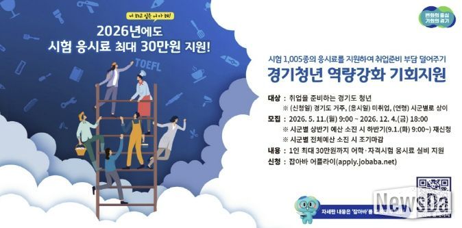 이 사업은 2025년 12월 1일~2026년 11월 30일 응시한 시험에 대해 1인당 최대 30만 원까지 응시료를 지원하며, 동일 시험의 경우 최대 3회까지 지원한다.