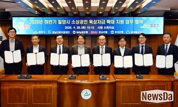 뉴스다 최광묵 기자 | 경남 밀양시는 28일 시청 소회의실에서 경남신용보증재단, NH농협은행, BNK경남은행, 우리은행, MG새마을금고와 2026년 하반기 소상공인 육성자금 지원을 위한 업무협약을 체결했다.