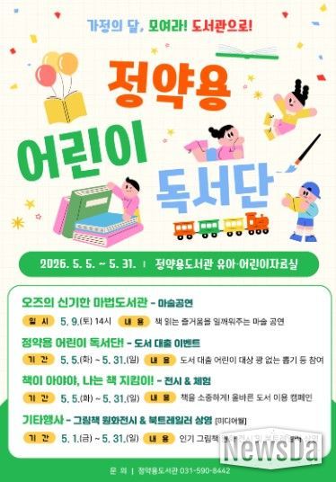 뉴스다 최광묵 기자 | 남양주시는 가정의 달을 맞아 5월 5일부터 31일까지 정약용도서관에서 ‘모여라! 정약용 어린이 독서단’ 행사를 운영한다고 28일 밝혔다.