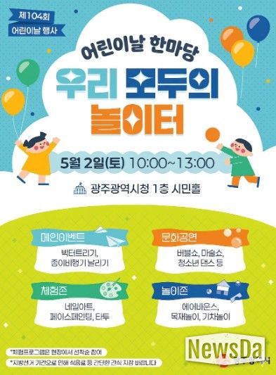 뉴스다 최광묵 기자 | 광주광역시는 어린이날을 기념해 오는 5월 2일 오전 10시부터 오후 1시까지 시청 1층 시민홀에서 특별행사를 연다.