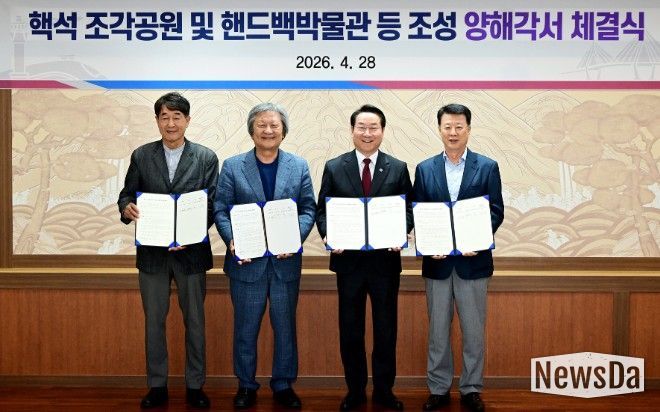 인천광역시는 4월 28일 인천시청 대접견실에서 조각가, ㈜시몬느, 블루코어PFV㈜와 ‘핵석 조각공원과 핸드백 박물관·핵석 전시관 조성’을 위한 양해각서를 체결했다.