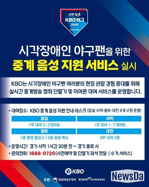 뉴스다 류대현 기자 | KBO는 2023년부터 잠실, 사직, 광주 구장에서 운영해 온 ‘KBO 리그 시각장애인 현장 관람객 대상 중계 음성 지원 서비스’를 올해 대전 한화생명 볼파크까지 확대해 총 4개 구장에서 운영한다.