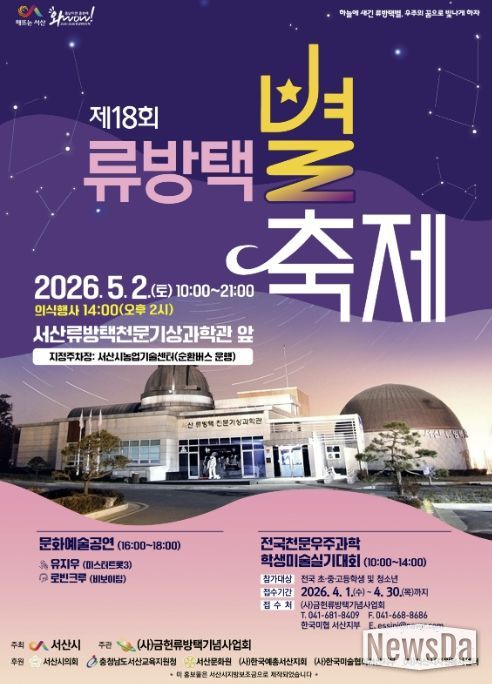 뉴스다 최광묵 기자 | 충남 서산시는 오는 5월 2일 류방택천문기상과학관 일원에서 제18회 류방택 별축제를 개최한다고 밝혔다.