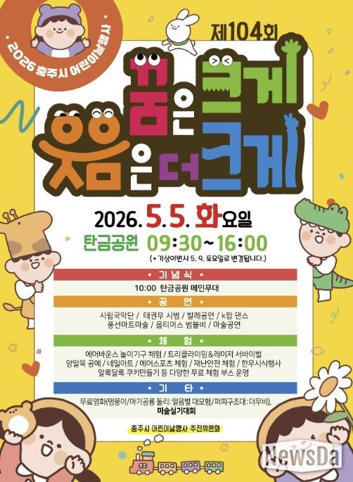 뉴스다 최광묵 기자 | 충주시는 오는 5월 5일 오전 9시 30분부터 탄금공원에서 ‘제104회 어린이날’을 기념하는 ‘2026 어린이날 행사’를 개최한다고 밝혔다.