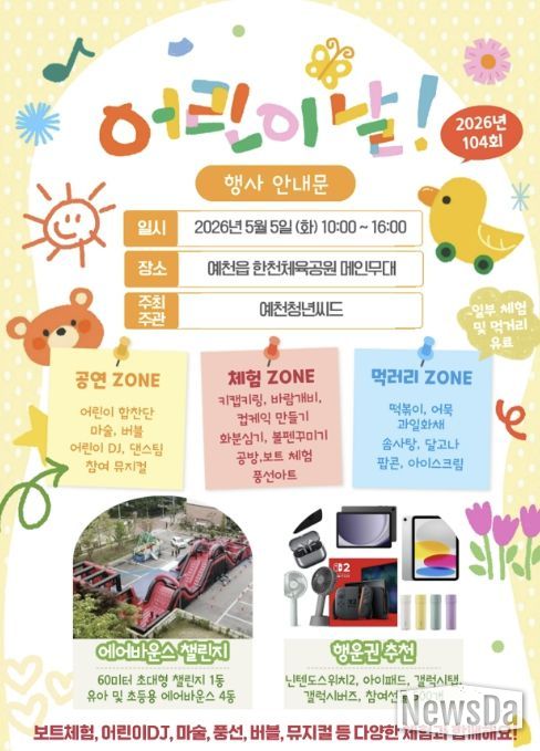 뉴스다 최광묵 기자 | 예천군은 제104회 어린이날을 맞아 오는 5월 5일 오전 10시부터 오후 4시까지 한천체육공원 메인무대 일원에서 ‘2026년 제104회 예천군 어린이날 기념행사’를 개최한다.