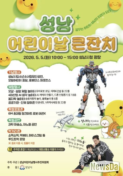 뉴스다 최광묵 기자 | 성남시는 오는 5월 5일 시청 광장과 1층 온누리에서 ‘어린이날 큰잔치’를 개최한다.