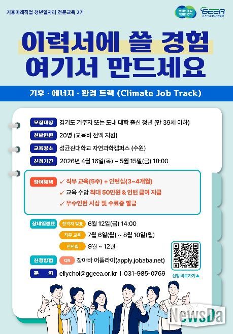 뉴스다 최광묵 기자 | 경기도와 경기환경에너지진흥원은 도내 기후·에너지·환경 분야 기업 취업을 희망하는 청년을 대상으로 ‘기후미래직업 청년일자리 전문과정’에 참여할 교육생 20명을 5월 15일까지 모집한다.