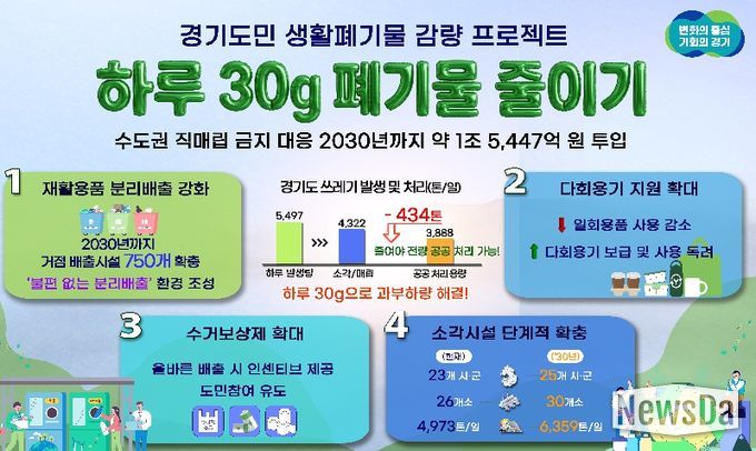 뉴스다 최광묵 기자 | 수도권 직매립 금지에 따른 생활쓰레기 감량을 위해 경기도가 2030년까지 5년간 약 1조 5,447억 원을 투입하는 ‘하루 30g, 도민실천형 생활폐기물 감량 프로젝트’를 추진한다.