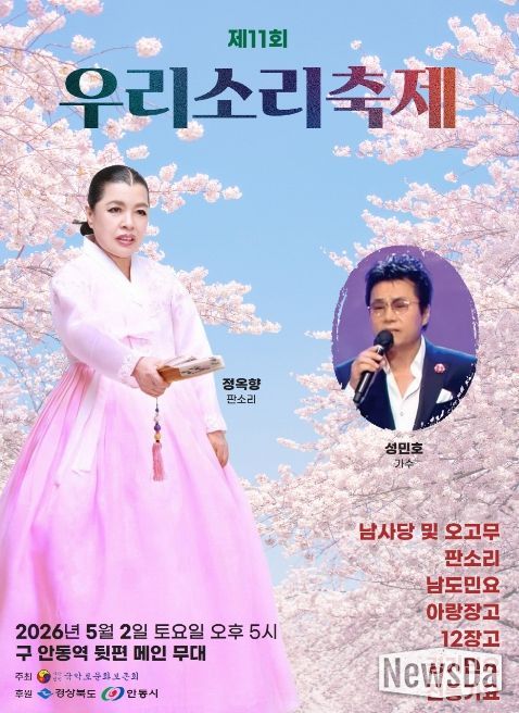 뉴스다 최광묵 기자 | 사단법인 국악로문화보존회가 주최․주관하는 '제11회 우리소리 축제'가 오는 5월 2일 오후 5시 안동 탈춤공원 무대에서 개최된다.