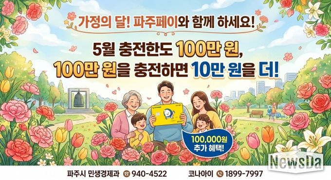 뉴스다 최광묵 기자 | 파주시는 5월 가정의 달을 맞아 5월 1일부터 5월 31일까지 한 달간 지역화폐 파주페이의 월 충전한도를 기존 70만 원에서 100만 원으로 상향한다.
