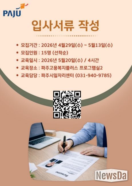 뉴스다 최광묵 기자 | 파주시는 중장년 구직자의 원활한 노동시장 재진입을 돕기 위해 ‘입사서류 작성 실습 교육’참여자 15명을 모집한다.
