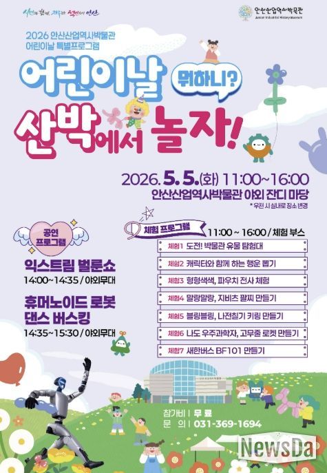 뉴스다 최광묵 기자 | 안산시는 내달 5일 어린이날을 맞아 안산산업역사박물관에서 어린이날 특별프로그램 ‘어린이날 뭐하니? 산박에서 놀자!’를 개최한다고 29일 밝혔다.