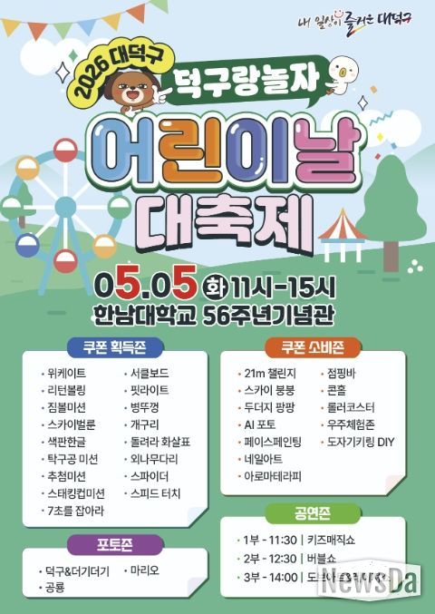 뉴스다 최광묵 기자 | 대전 대덕구는 제104회 어린이날을 맞아 아동과 가족이 함께 즐길 수 있는 ‘덕구랑 놀자! 대덕구 어린이날 대축제’를 개최한다고 밝혔다.
