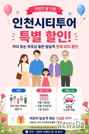 뉴스다 최광묵 기자 | 인천관광공사는 5월 가정의 달을 맞아 가족 단위 관광객 유입을 확대하고 이용객의 재방문 활성화를 위한‘인천시티투어 특별 프로모션’을 실시한다고 밝혔다