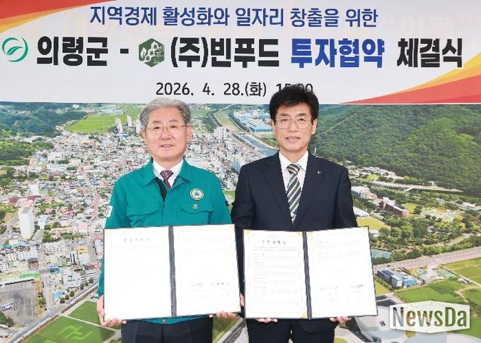 뉴스다 최광묵 기자 | 의령군은 지난 28일 군수실에서 ㈜빈푸드(대표 홍효선)와 투자협약(MOU)을 체결했다고 밝혔다.