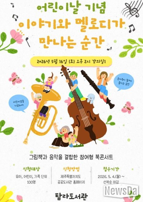 뉴스다 최광묵 기자 | 제주시 탐라도서관은 어린이날을 맞아 5월 16일 도서관 강의실에서 온 가족이 함께 즐길 수 있는 북콘서트 ‘이야기와 멜로디가 만나는 순간’을 개최한다.