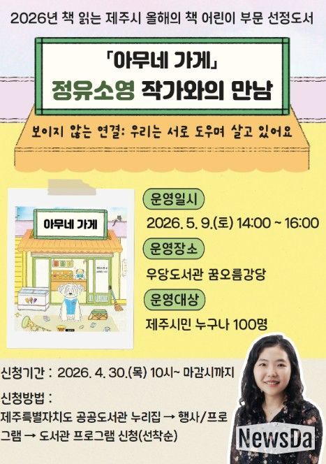 먼저 5월 9일에는 ‘2026 제주시 올해의 책’ 어린이 부문 선정 도서인 ‘아무네 가게’의 저자 정유소영 작가를 초청해 강연을 진행한다.