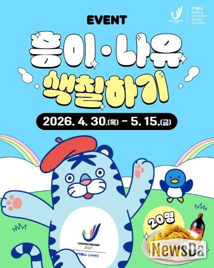 뉴스다 류대현 기자 | 2027 충청 유니버시아드대회 조직위원회는 어린이날을 맞아 마스코트 ‘흥이&나유’ 색칠놀이 활동자료를 30일부터 대회 공식 홈페이지를 통해 배포한다고 밝혔다.