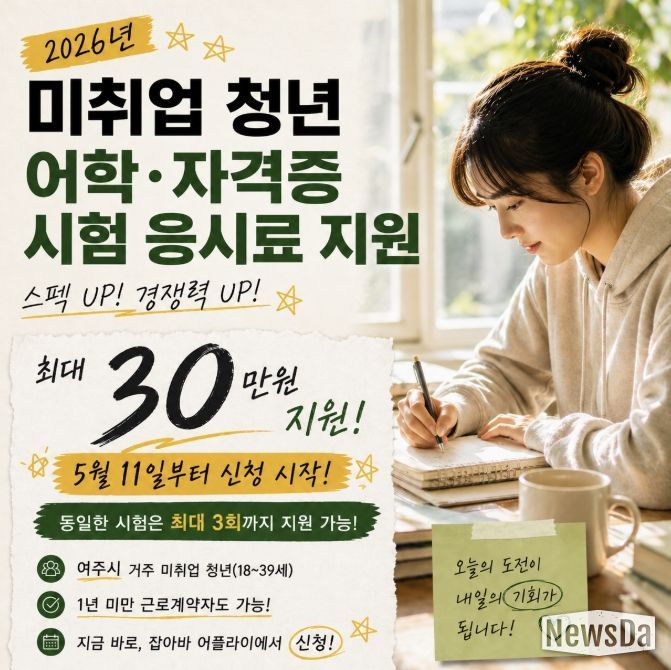 뉴스다 최광묵 기자 | 여주시는 오는 5월 11일부터 미취업 청년에 어학·자격시험 응시료를 지원하는 ‘경기청년 역량강화 기회지원’ 사업 접수를 시작한다.