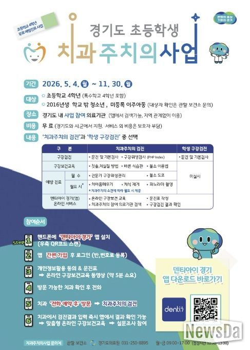뉴스다 최광묵 기자 | 의왕시 보건소가 오는 5월 4일부터 11월 30일까지 ‘2026년 경기도 초등학생 치과주치의사업’을 시행한다.