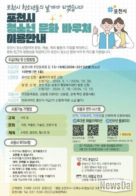 뉴스다 최광묵 기자 | 포천시는 청소년의 문화 접근성을 높이고 다양한 체험 기회를 제공하기 위해 ‘포천시 청소년 문화 바우처 지원사업’을 본격 시행한다.