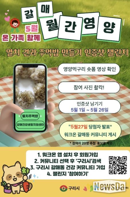 뉴스다 최광묵 기자 | 구리시 갈매건강생활지원센터는 오는 5월 1일부터 5월 26일까지 주민 주도형 식습관 개선 사업의 일환으로 ‘우리 가족 뼈 건강 지킴이! 멸치 견과 주먹밥 만들기 인증 사진 참여 잇기(챌린지)’를 추진한다고 밝혔다.