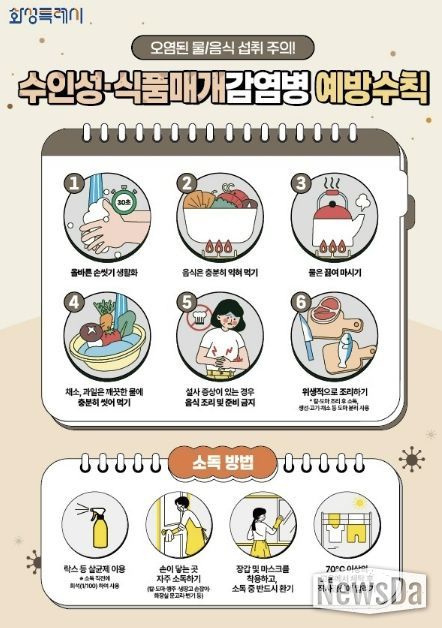 주요 예방수칙은 ▲흐르는 물에 비누로 30초 이상 손 씻기 ▲음식은 충분히 익혀 먹기 ▲물은 끓여 마시기 ▲채소와 과일은 깨끗이 씻어 섭취하기 ▲설사 증상 시 음식 조리 금지 ▲조리기구 구분 사용 등이다.