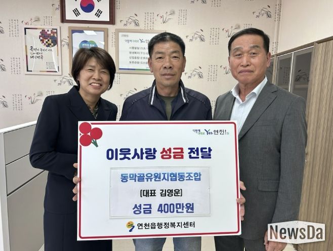 뉴스다 최광묵 기자 | 동막골유원지협동조합은 지난 28일 오후 4시 연천읍행정복지센터 읍장실에서 이웃돕기 후원 성금 400만 원을 기탁했다.
