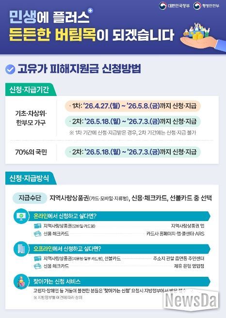 이번 1차 지원 대상은 기초생활수급자, 차상위계층, 한부모가족 등으로 신청 기간은 5월 8일까지이며 첫 주에는 출생 연도 끝자리에 따른 요일제를 적용한다. 이어 5월 18일부터는 소득 하위 70%를 대상으로 한 2차 신청이 진행될 예정이다.