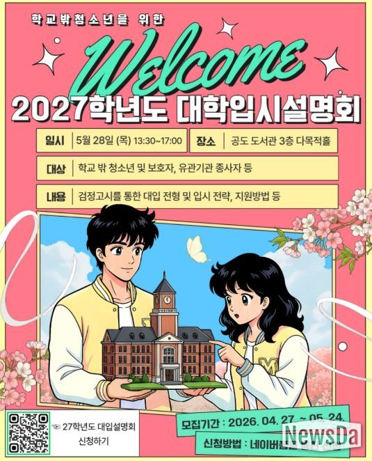 뉴스다 최광묵 기자 | 안성시학교밖청소년지원센터는 학교 밖 청소년의 성공적인 진학을 돕기 위해 오는 5월 28일 오후 1시 30분부터 공도 도서관 다목적홀에서 ‘2027학년도 대학 입시 설명회’를 개최한다고 밝혔다.