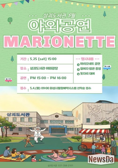 뉴스다 최광묵 기자 | 화성시립 삼괴도서관은 5월 가정의 달을 맞아 오는 5월 23일, 도서관 야외광장에서 가족 단위 이용자를 위한 특별한 문화행사를 운영한다. 따뜻한 봄날의 야외 공간에서 누구나 편안하게 즐길 수 있도록 마련된 이번 행사는 도서관을 찾는 시민들에게 색다른 문화 경험과 여유로운 시간을 제공할 예정이다.